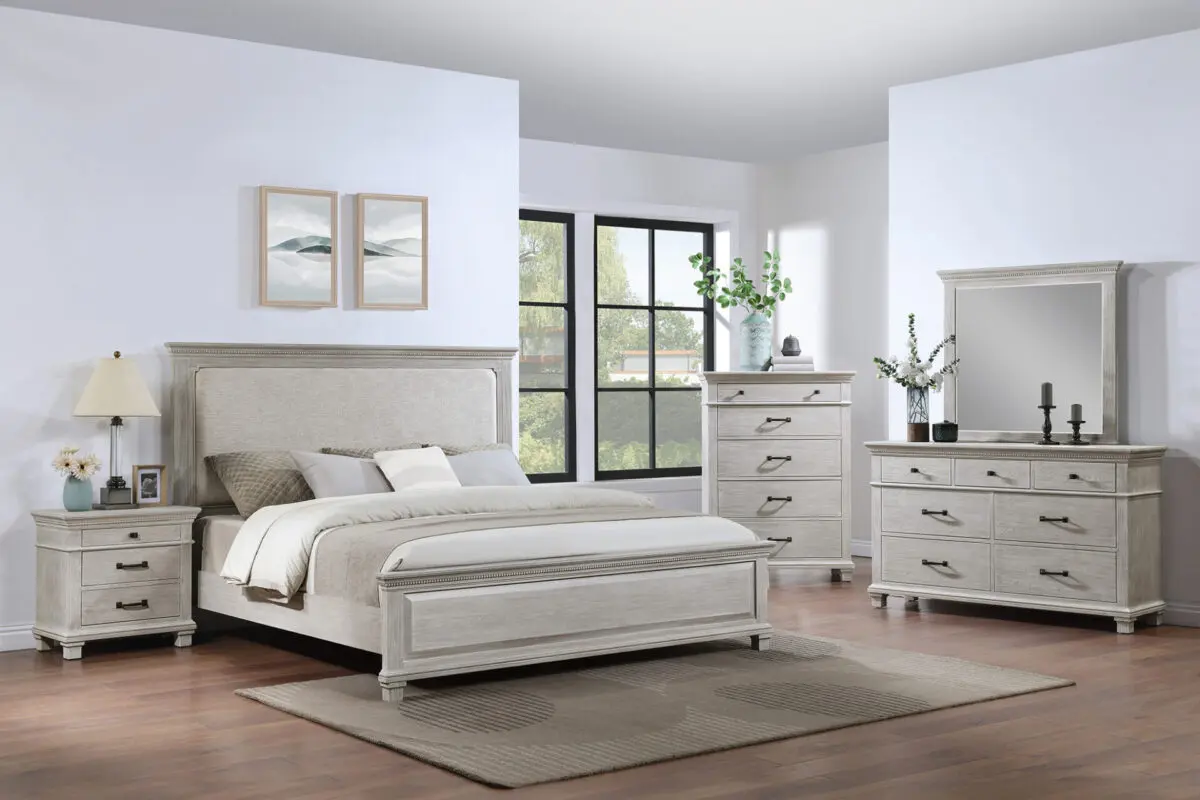 Silver Sands 6 Piece Bedroom Set brings a calm, misty gray palette and clean transitional lines to your bedroom, blending farmhouse warmth with modern simplicity. Crafted from solid pine, manufactured woods, and oak veneers, each piece is built for long-lasting strength, while the multi-step, hand-applied finish highlights the natural grain and mineral patterns of the wood for a softly weathered look.