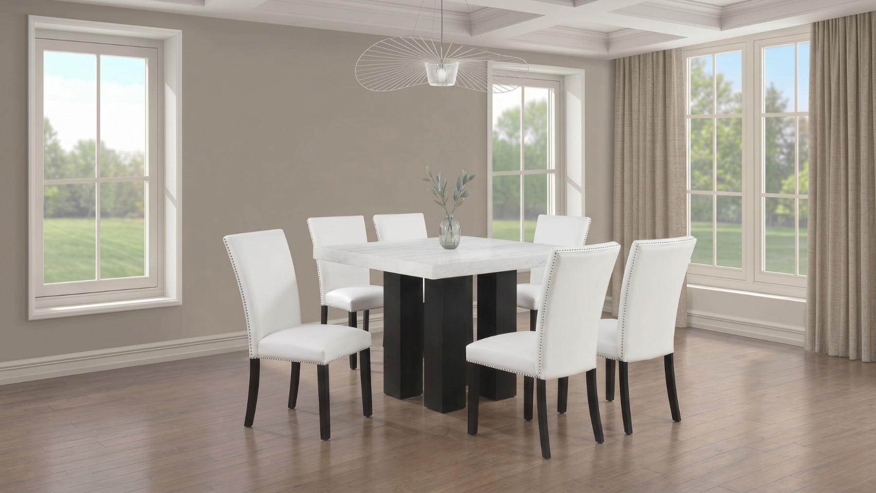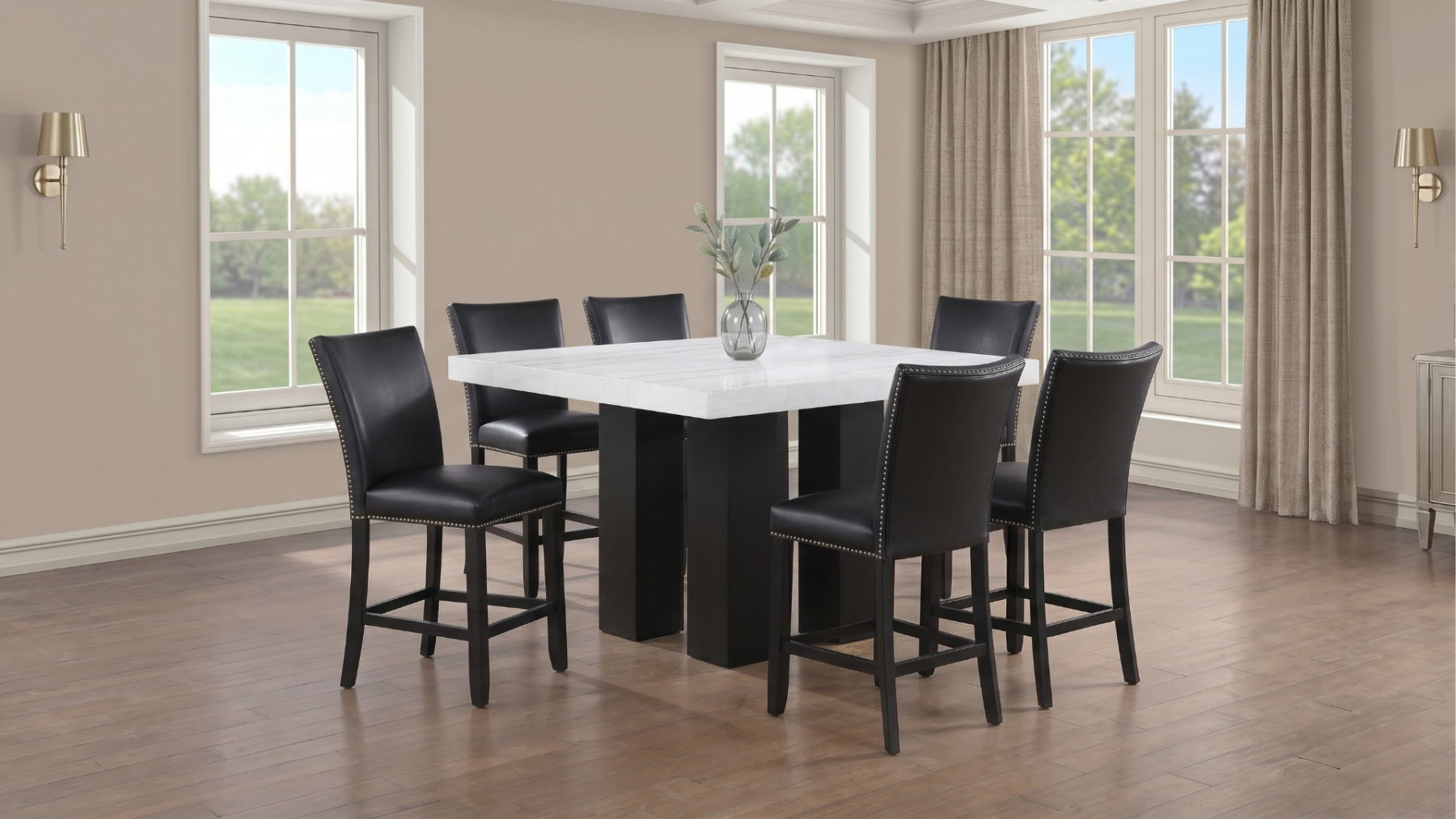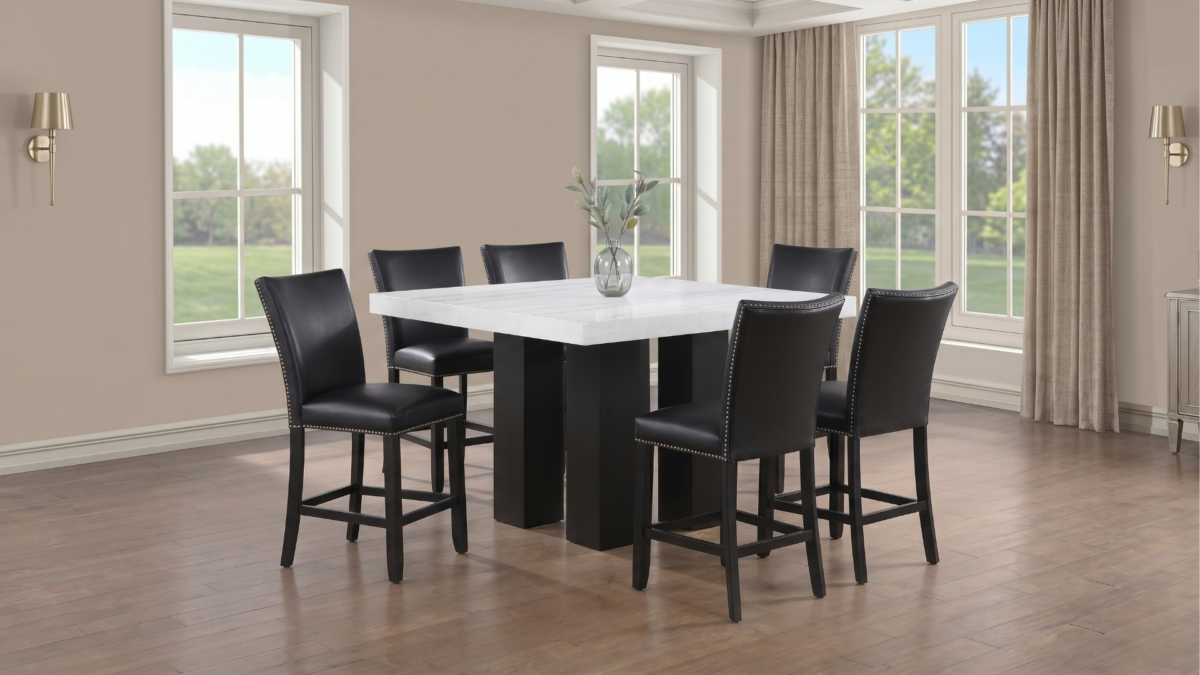 The Artemis White 7 Piece Counter Height Dining Room Set offers an elegant dining experience with a modern twist for your home. This collection features a stunning 54-inch square silhouette that comfortably seats up to eight guests. The weighty 3-inch white marble veneered top provides a luxurious profile that serves as a beautiful focal point. Consequently, the deep black wood base ensures the table remains incredibly functional and stable for daily use. This set is perfect for those who want to combine high-end aesthetics with practical design. Browse our full collection of Counter Height Dining Room Sets to find the perfect fit for your home.