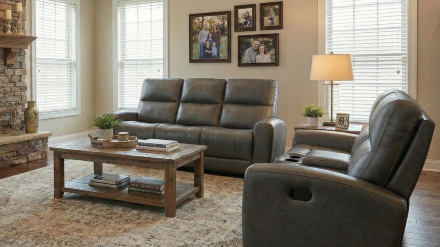 The sofa and loveseat with console are upholstered in a rich, charcoal-toned leather that complements the rustic stone fireplace shown in the room. Furthermore, the leather surface is easy to wipe down, making it a practical choice for high-traffic family rooms. Consequently, the Madras Grey 2 Piece Living Room Set maintains its elegant appearance even with daily use. Each piece features heavy-duty stitching that reinforces the seams for maximum durability. However, the leather remains remarkably soft to the touch, providing an immediate sense of relaxation.