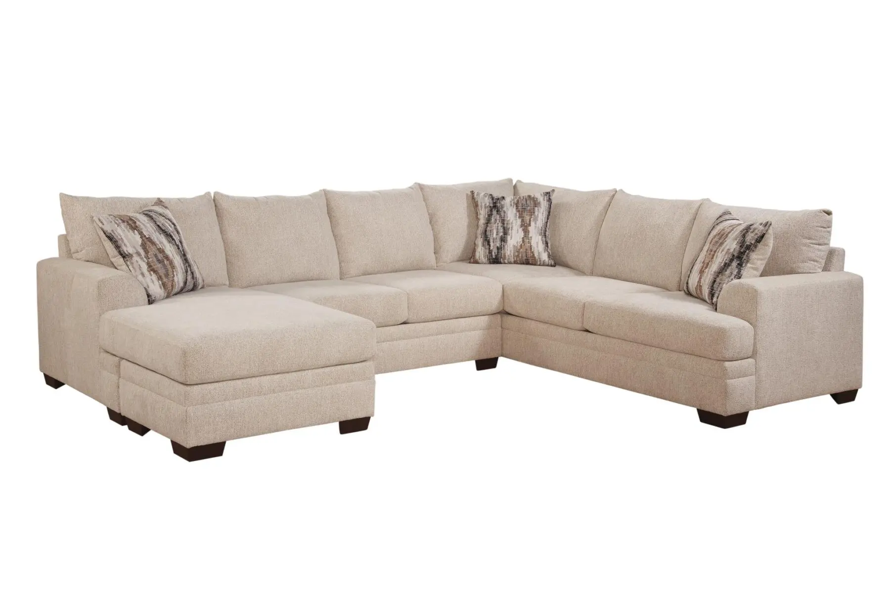 This Wayne Sand 2 Piece Sectional with Chaise includes beautiful designer toss pillows that feature earth-toned patterns. These accents tie the sand fabric into darker wood elements or decor in your space. Furthermore, the woven fabric is engineered for durability and breathability. It is easy to keep this sectional looking fresh with regular light maintenance. Transitioning your decor through the seasons is simple with such a neutral base. For those seeking a mix of grand scale and refined style, this sectional delivers on every front.